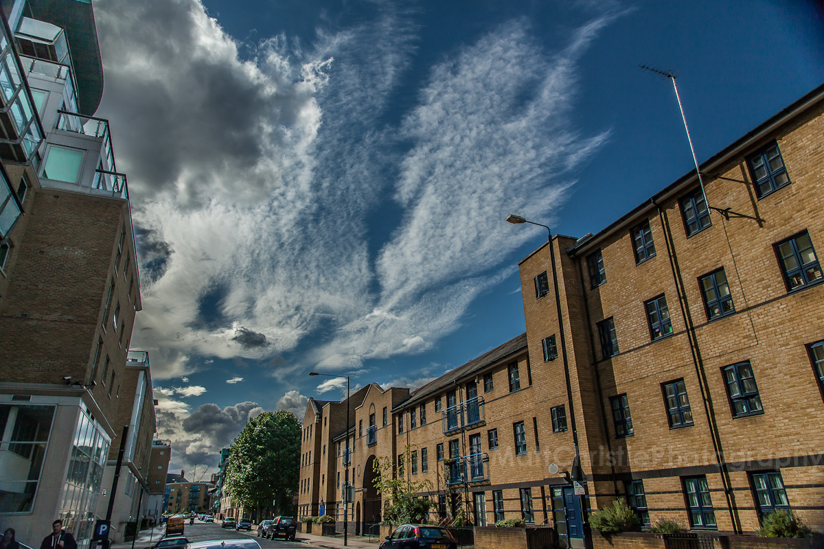 I’m reading a book at the moment that rightly recommends that you should always go outdoors at dawn or dusk for the best shots, but it pointed out that it’s also a good idea to get out in the daytime in between storms, as the skies can be pretty impressive. Literally as I was reading this, the rain outside briefly stopped, so I took that as a sign & grabbed a camera & a Boris Bike & headed out. (to be fair, I’d left my hat in the pub the day before so was going out anyway, but the book make me take the camera!)